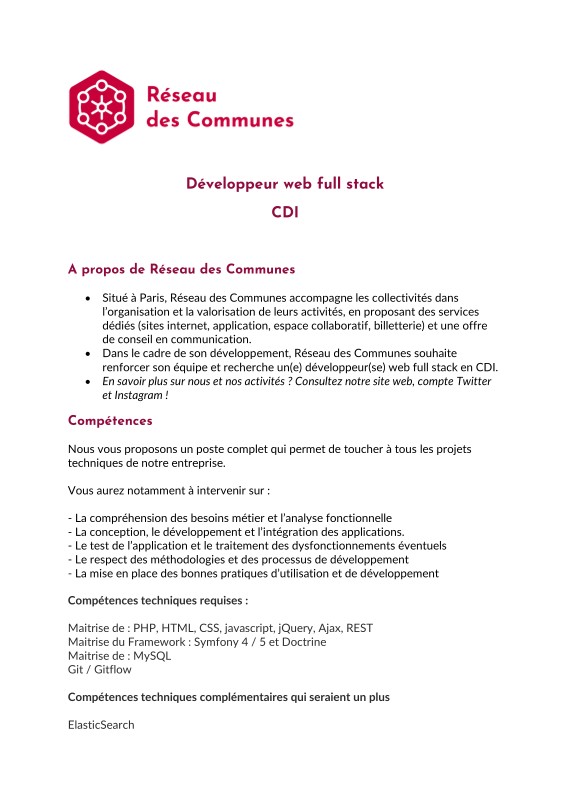 Développeur.se web full stack (Symfony) < Retour Réseau des Communes CDI Réseau des Communes recherche activement un.e développeur.se web full stack (Symfony) en CDI pour renforcer ses équipes. Postuler ici